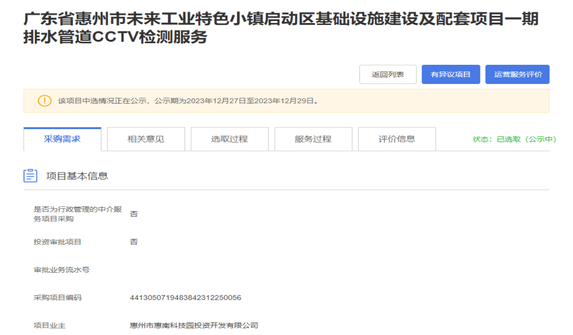 【招標(biāo)公示】廣東省惠州市未來(lái)工業(yè)特色小鎮(zhèn)啟動(dòng)區(qū)基礎(chǔ)設(shè)施建設(shè)及配套項(xiàng)目一期排水管道CCTV檢測(cè)服務(wù)