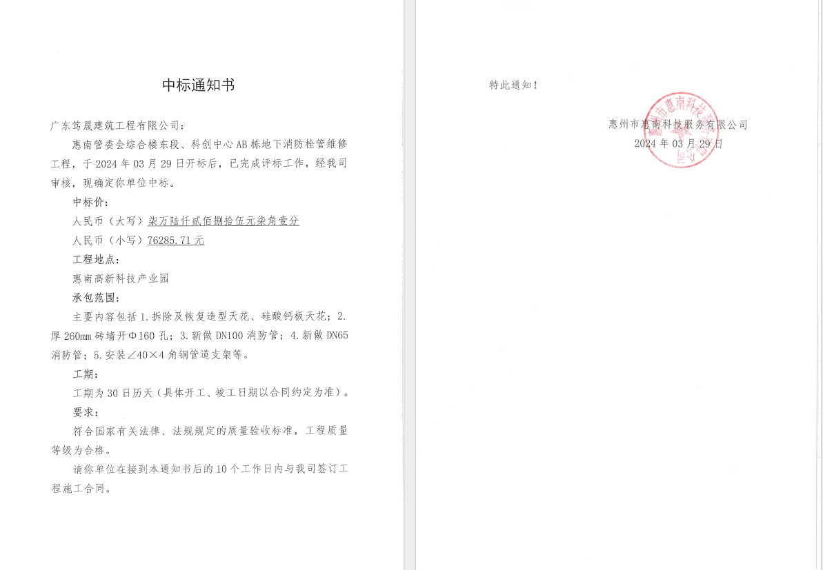 【中標(biāo)通知】惠南管委會綜合樓東段、科創(chuàng)中心AB棟地下消防栓管維修工程