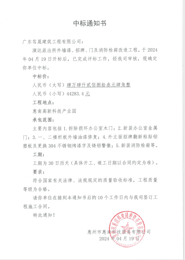 【中標(biāo)通知】演達(dá)派出所外墻漆、招牌、門(mén)及消防栓箱改造工程