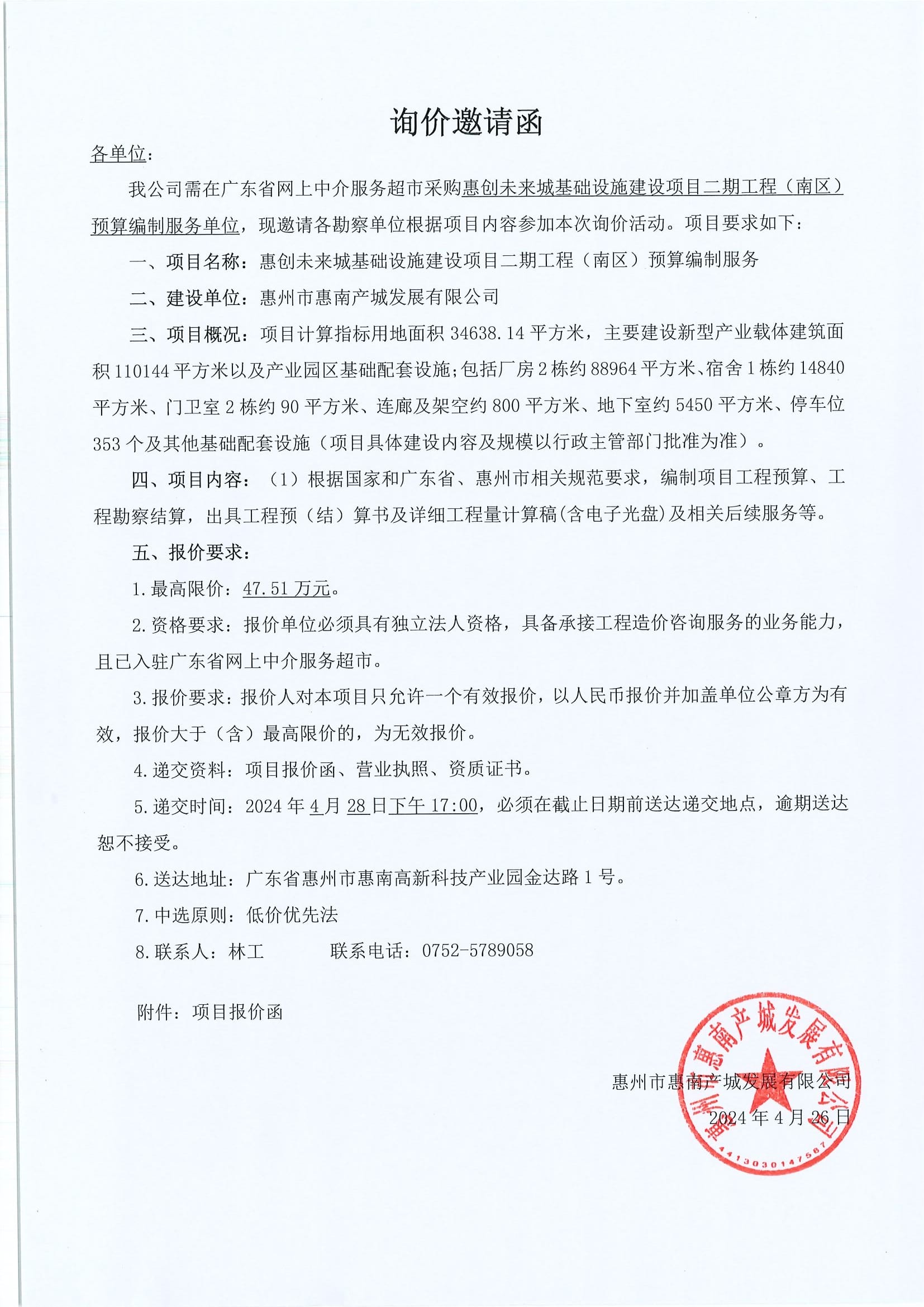 惠創(chuàng)未來(lái)城基礎(chǔ)設(shè)施建設(shè)項(xiàng)目二期工程(南區(qū))預(yù)算編制服務(wù)詢價(jià)邀請(qǐng)函