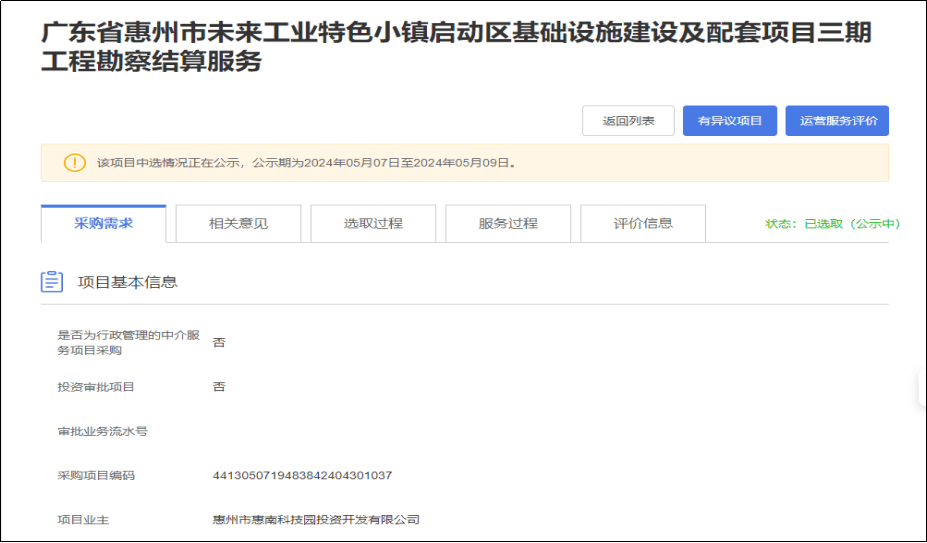 【公示】廣東省惠州市未來工業(yè)特色小鎮(zhèn)啟動區(qū)基礎設施建設及配套項目三期工程勘察結算服務