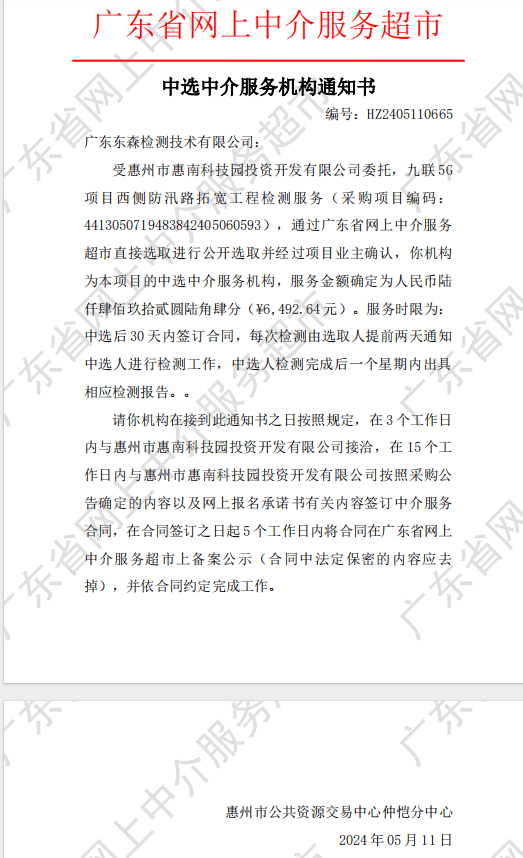 【中選公示】九聯(lián)5G項目西側防汛路拓寬工程檢測服務