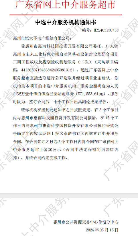 【中選公示】廣東省惠州市未來工業(yè)特色小鎮(zhèn)啟動(dòng)區(qū)基礎(chǔ)設(shè)施建設(shè)及配套項(xiàng)目三期工程放線及規(guī)劃驗(yàn)收測繪服務(wù)(二次)