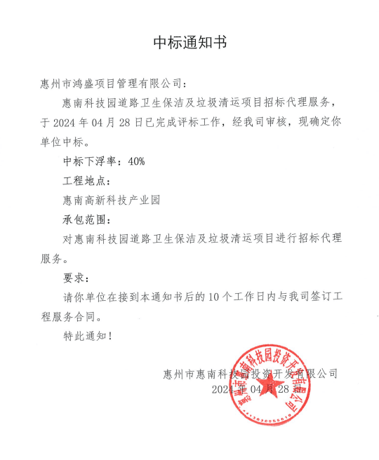 【中標通知】惠南科技園道路衛(wèi)生保潔及垃圾清運項目招標代理服務
