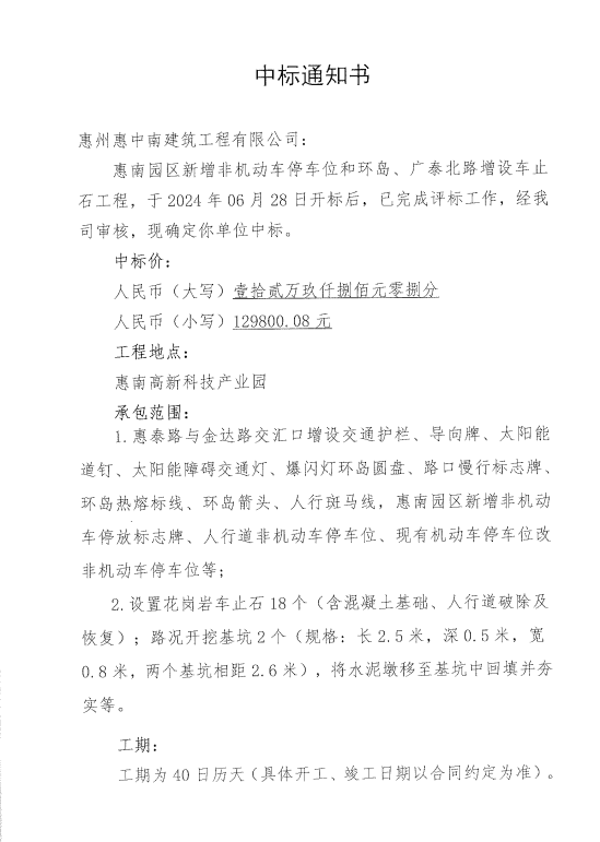 【中標通知】惠南園區(qū)新增非機動車停車位和環(huán)島、廣泰北路增設車止石工程