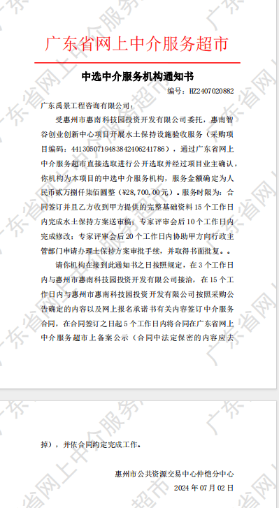 【中選通知】惠南智谷創(chuàng)業(yè)創(chuàng)新中心項目開展水土保持設(shè)施驗收服務(wù)