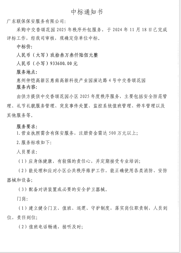 【中標(biāo)通知】采購中交香頌花園2025年秩序外包服務(wù)