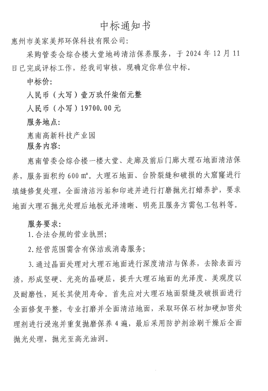 【中標(biāo)通知】采購(gòu)管委會(huì)綜合樓大堂地磚清潔保養(yǎng)服務(wù)