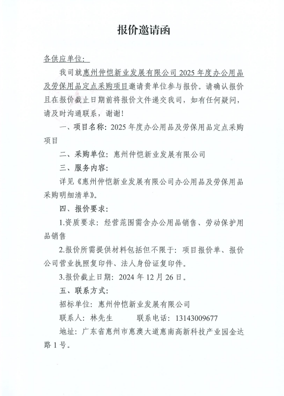 惠州仲愷新業(yè)發(fā)展有限公司2025年度辦公用品及勞保用品定點采購報價邀請函