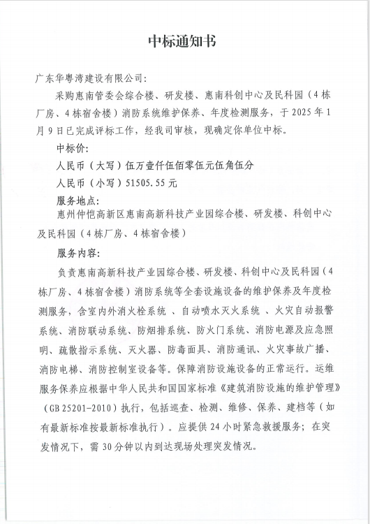 【中標(biāo)通知】采購惠南管委會綜合樓、研發(fā)樓、惠南科創(chuàng)中心及民科園(4棟廠房、4棟宿舍樓)消防系統(tǒng)維護(hù)保養(yǎng)、年度檢測服務(wù)
