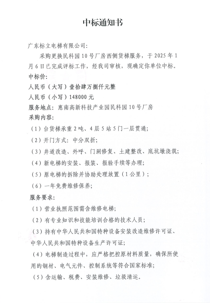 【中標(biāo)通知】采購更換民科園10號廠房西側(cè)貨梯服務(wù)