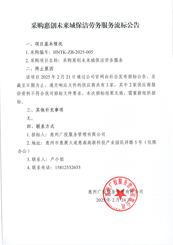 【招標(biāo)公告】采購惠創(chuàng)未來城保潔勞務(wù)服務(wù)流標(biāo)公告