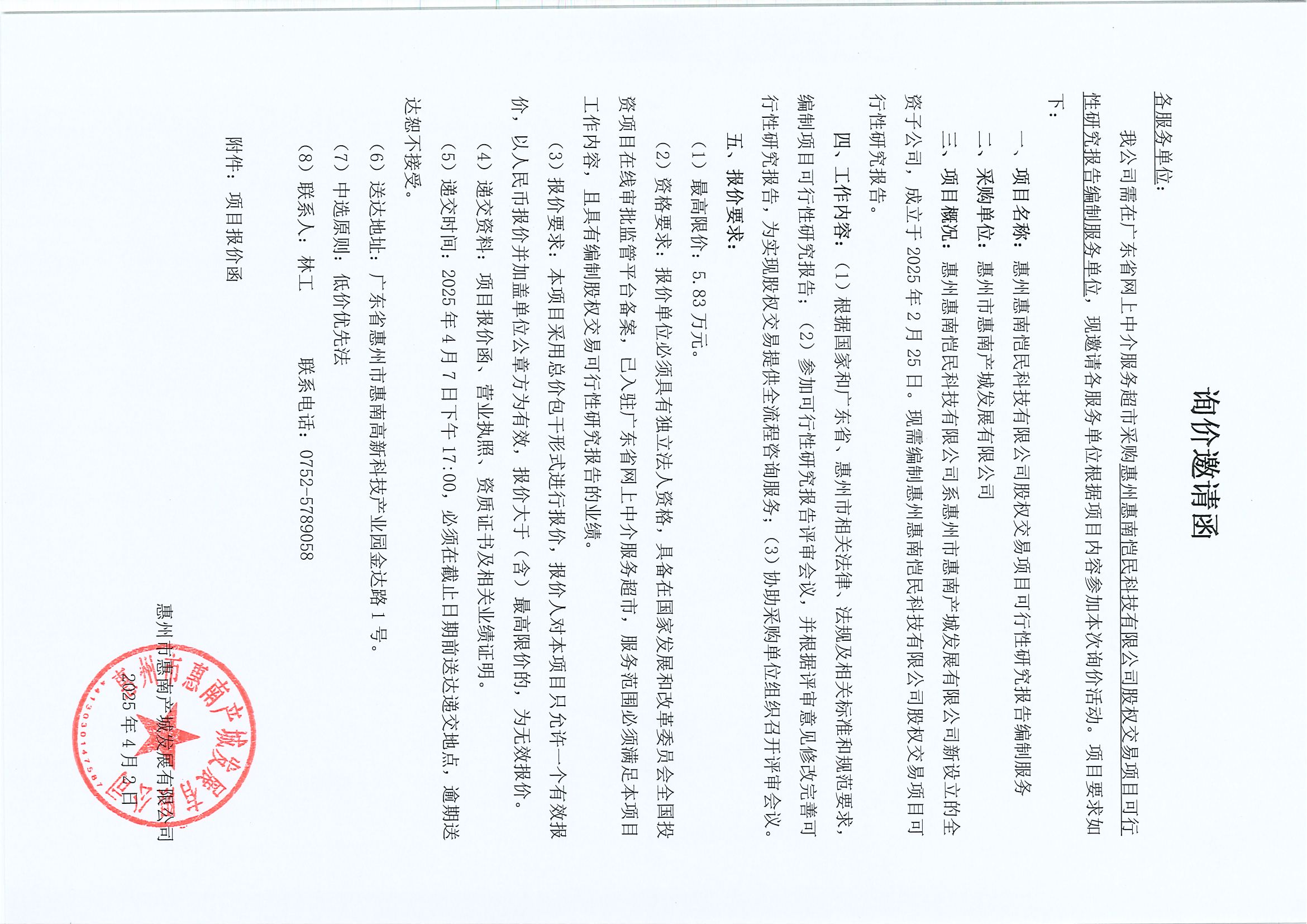 【詢價邀請函】惠州惠南愷民科技有限公司股權(quán)交易項目可行性研究報告編制服務(wù)