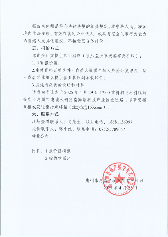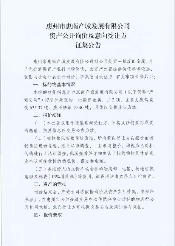 【招標(biāo)公告】惠州市惠南產(chǎn)城發(fā)展有限公司 資產(chǎn)公開詢價(jià)及意向受讓方征集公告