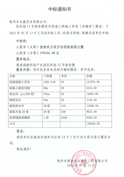 【中標(biāo)通知】民科園12號宿舍樓室外改造工程施工勞務(wù)(含輔材)服務(wù)