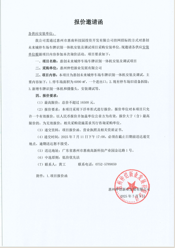 【報(bào)價(jià)邀請函】惠創(chuàng)未來城停車場車牌識別一體機(jī)安裝及調(diào)試項(xiàng)目采購安裝單位