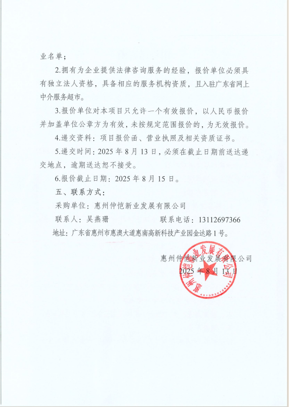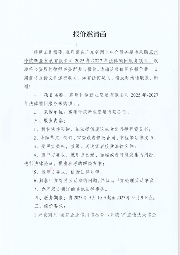 【報(bào)價(jià)邀請函】惠州仲愷新業(yè)發(fā)展有限公司2025年-2027年法律顧問服務(wù)采購項(xiàng)目