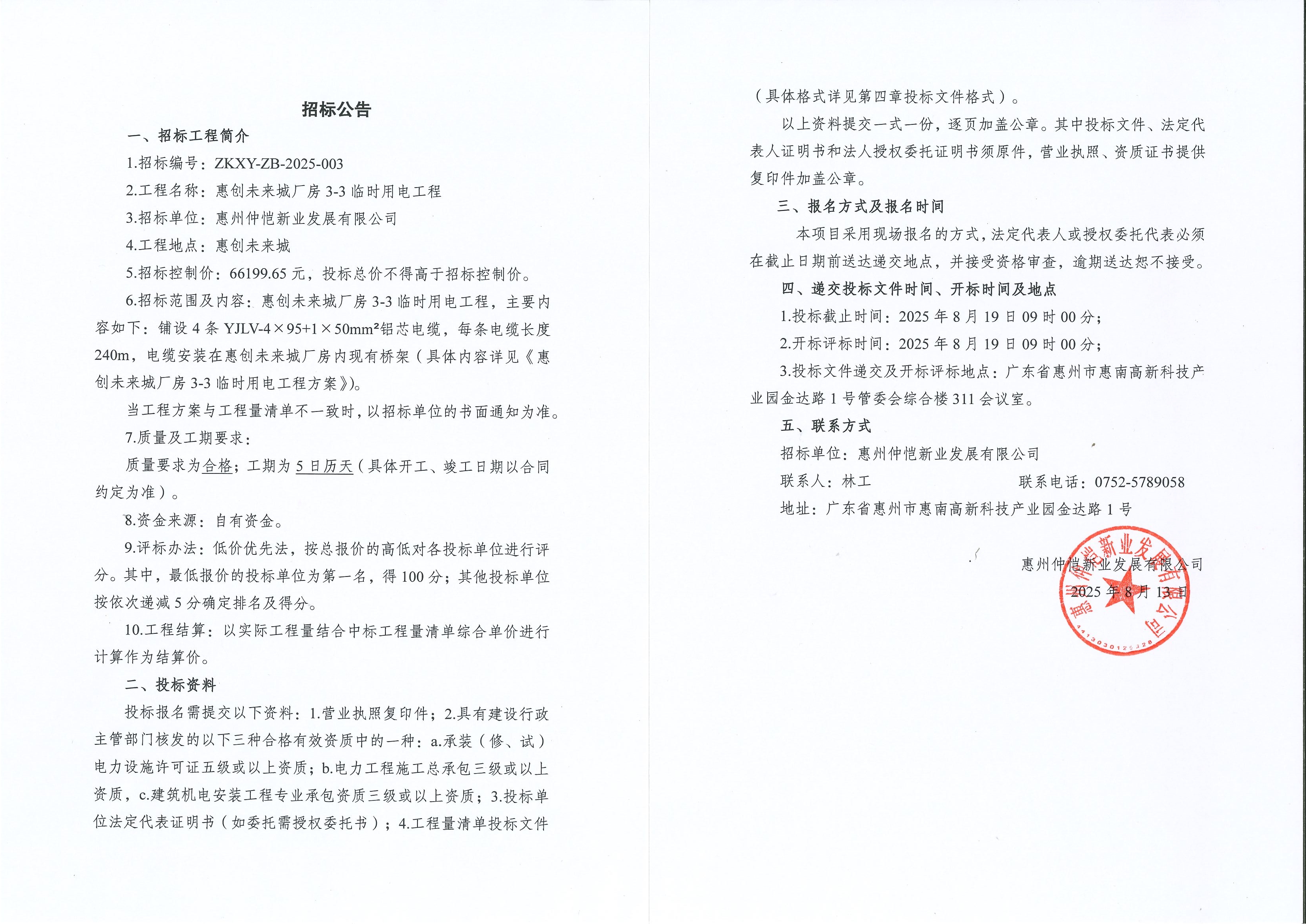 【招標(biāo)公告】惠創(chuàng)未來(lái)城廠房3-3臨時(shí)用電工程