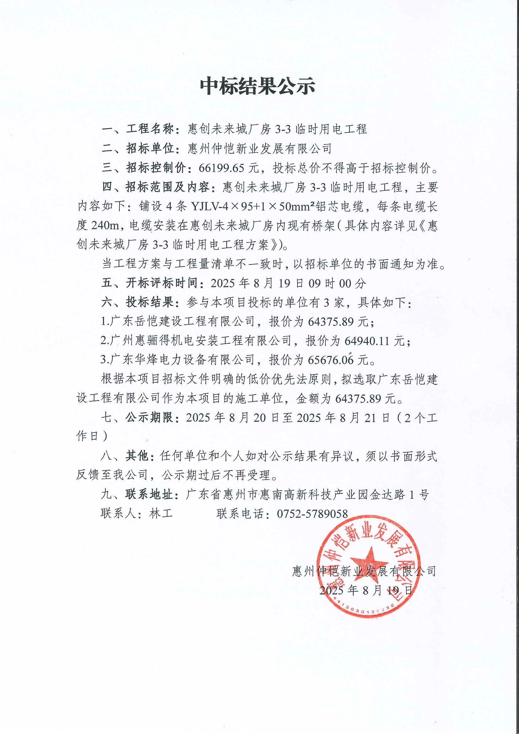 【中標(biāo)結(jié)果公示】惠創(chuàng)未來(lái)城廠房3-3臨時(shí)用電工程