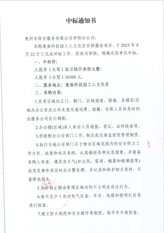 【中標(biāo)通知】采購惠南科技園工人文化宮安保服務(wù)項(xiàng)目