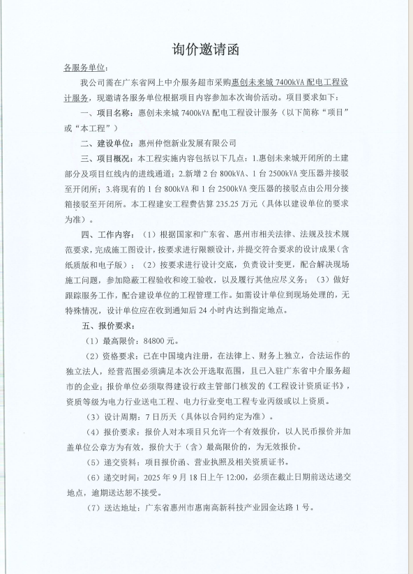【詢價(jià)邀請(qǐng)函】惠創(chuàng)未來城7400kVA配電工程設(shè)計(jì)服務(wù)