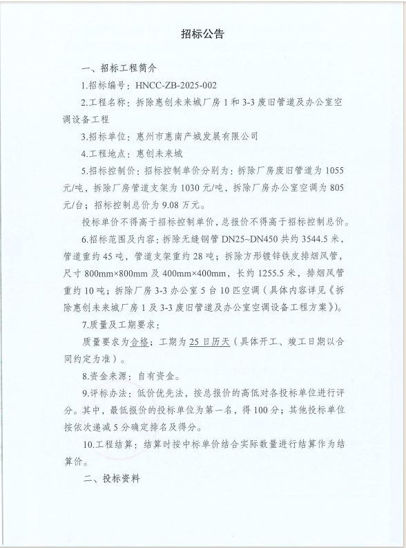 【招標(biāo)公告】拆除惠創(chuàng)未來城廠房1和3-3廢舊管道及辦公室空調(diào)設(shè)備工程