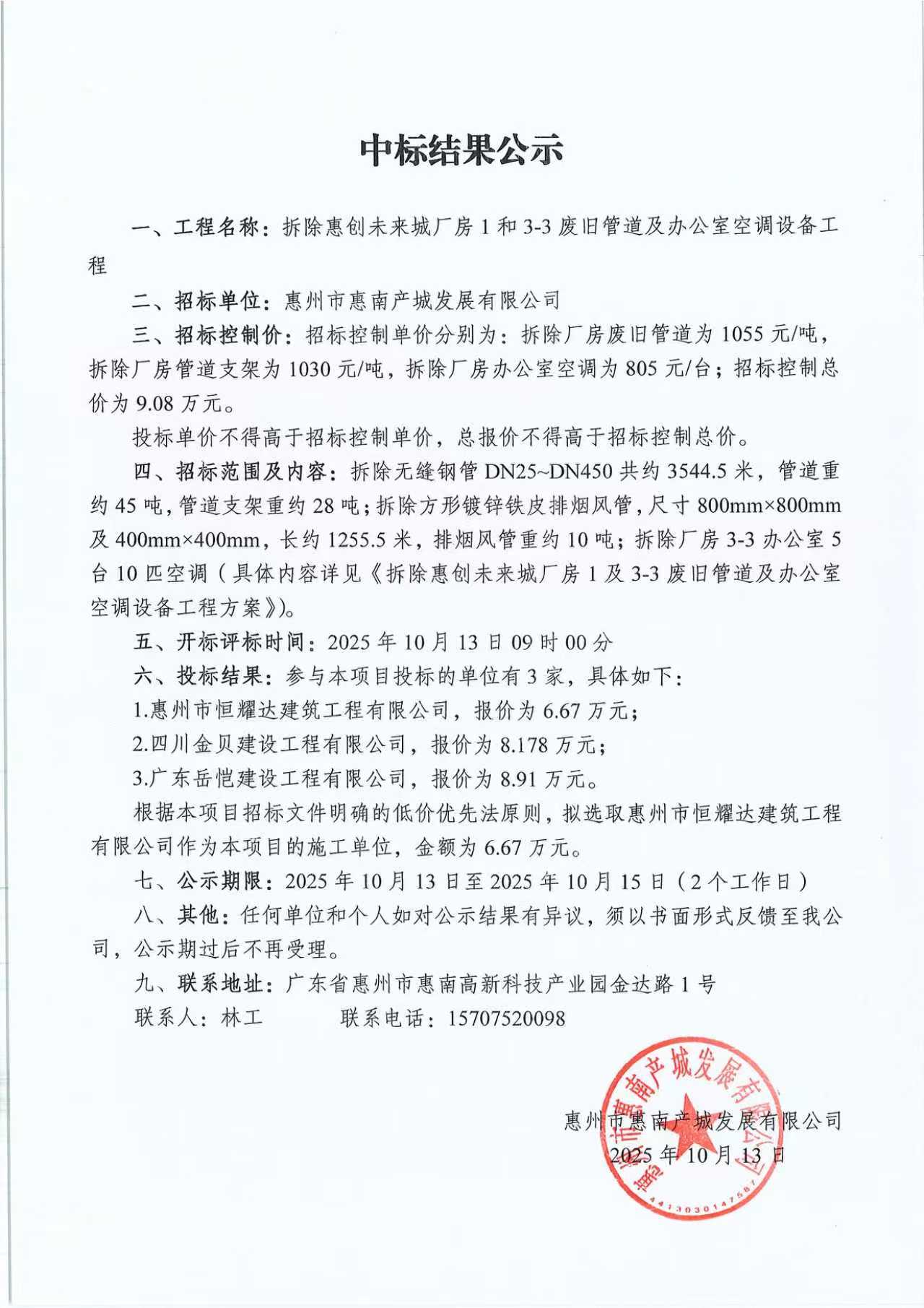 【中標(biāo)結(jié)果公示】拆除惠創(chuàng)未來城廠房1和3-3廢舊管道及辦公室空調(diào)設(shè)備工程