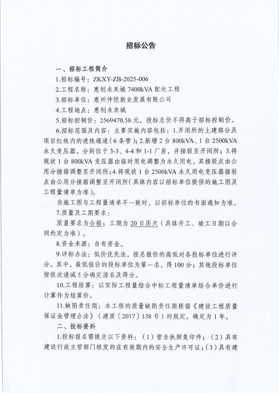 【招標(biāo)公告】惠創(chuàng)未來城7400kVA配電工程