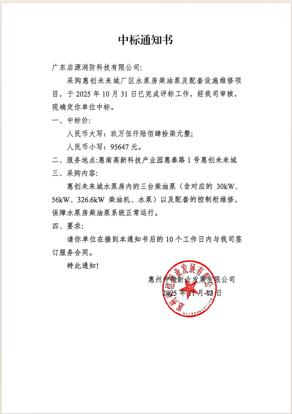 【中標(biāo)通知書】惠創(chuàng)未來城廠區(qū)水泵房柴油泵及配套設(shè)施維修項目