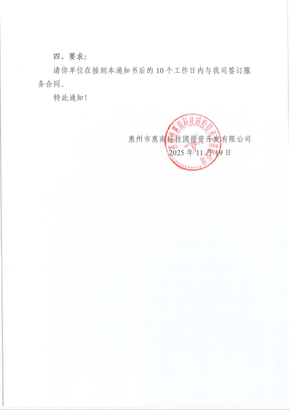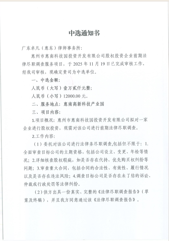 【中選通知】惠州市惠南科技園投資開發(fā)有限公司股權投資企業(yè)前期法律盡職調查服務項目