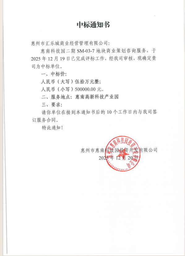 【中標(biāo)通知】惠南科技園二期SM-03-7地塊商業(yè)策劃咨詢服務(wù)