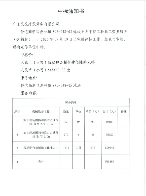 【中標(biāo)通知】仲愷高新區(qū)瀝林鎮(zhèn)ZKE-048-05地塊土方平整工程施工勞務(wù)服務(wù)(含輔材)