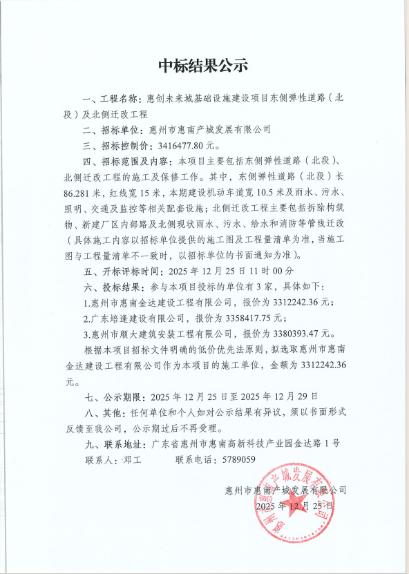 【中標(biāo)結(jié)果公示】惠創(chuàng)未來(lái)城基礎(chǔ)設(shè)施建設(shè)項(xiàng)目東側(cè)彈性道路(北段)及北側(cè)遷改工程