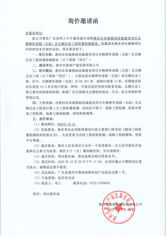 【詢價邀請函】惠創(chuàng)未來城基礎設施建設項目東側彈性道路(北段)及北側遷改工程質量檢測服務