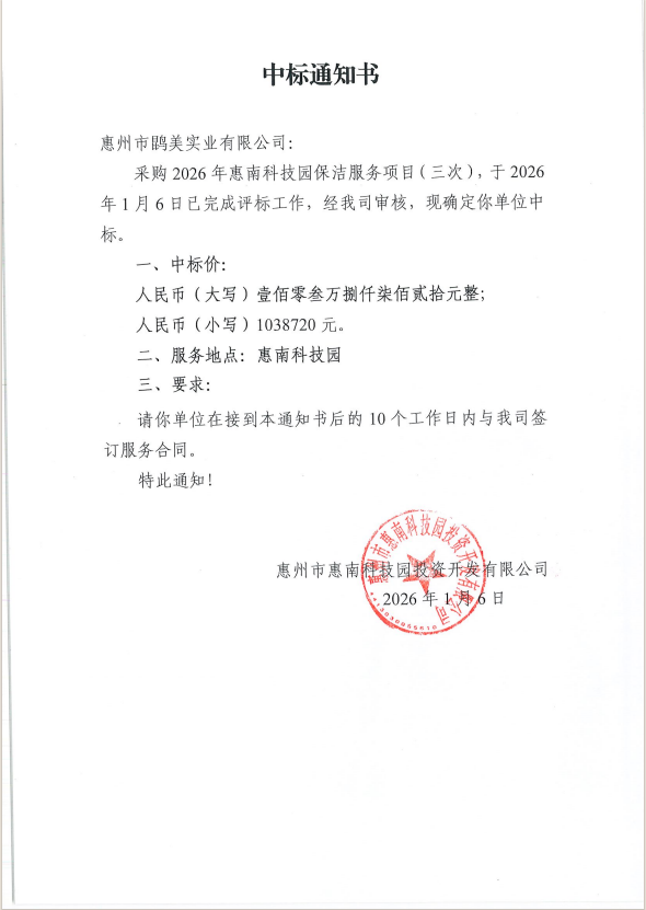 【中標(biāo)通知】采購2026年惠南科技園保潔服務(wù)項目(三次)