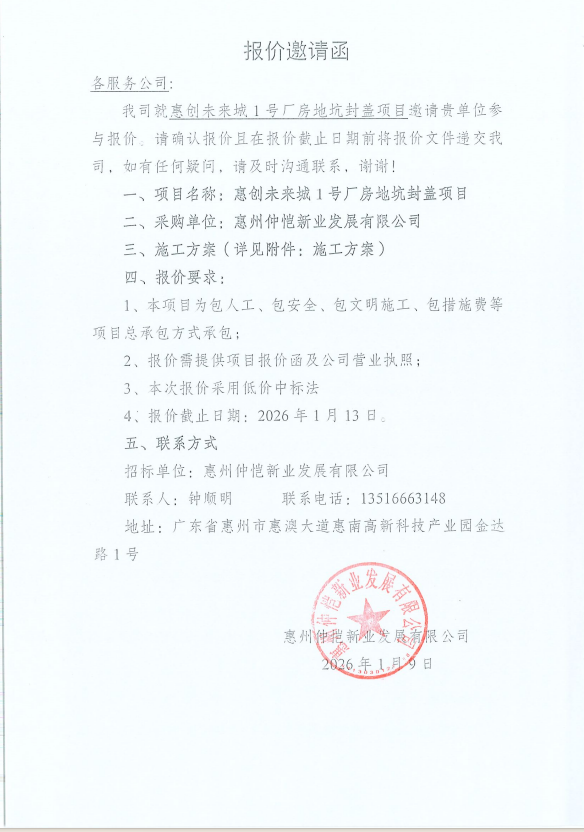 【報(bào)價(jià)邀請函】惠創(chuàng)未來城1號(hào)廠房地坑封蓋項(xiàng)目