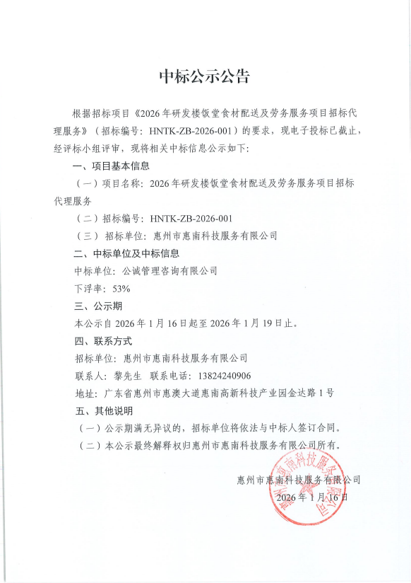 【中標(biāo)公示】2026年研發(fā)樓飯?zhí)檬巢呐渌图皠趧?wù)服務(wù)項(xiàng)目招標(biāo)代理服務(wù)